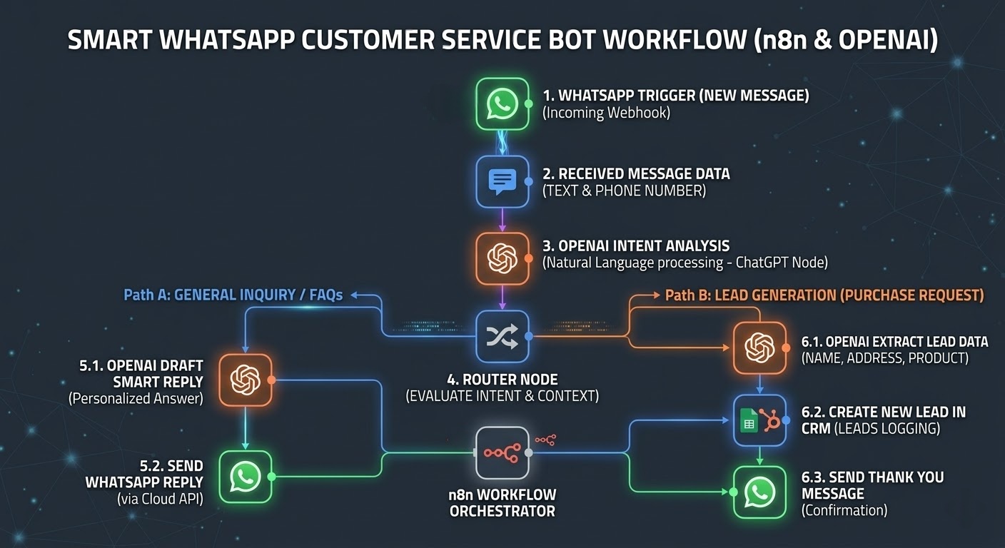 This is where the urgent need to merge Business Automation and Artificial Intelligence (AI) arises. In this comprehensive guide, we will learn how to move beyond annoying traditional bots (that rely on rigid rules and pressing numbers) to build a "Smart WhatsApp Bot" that understands customer intent, replies in a polite human-like manner, and automatically logs leads into your CRM system using the n8n platform.