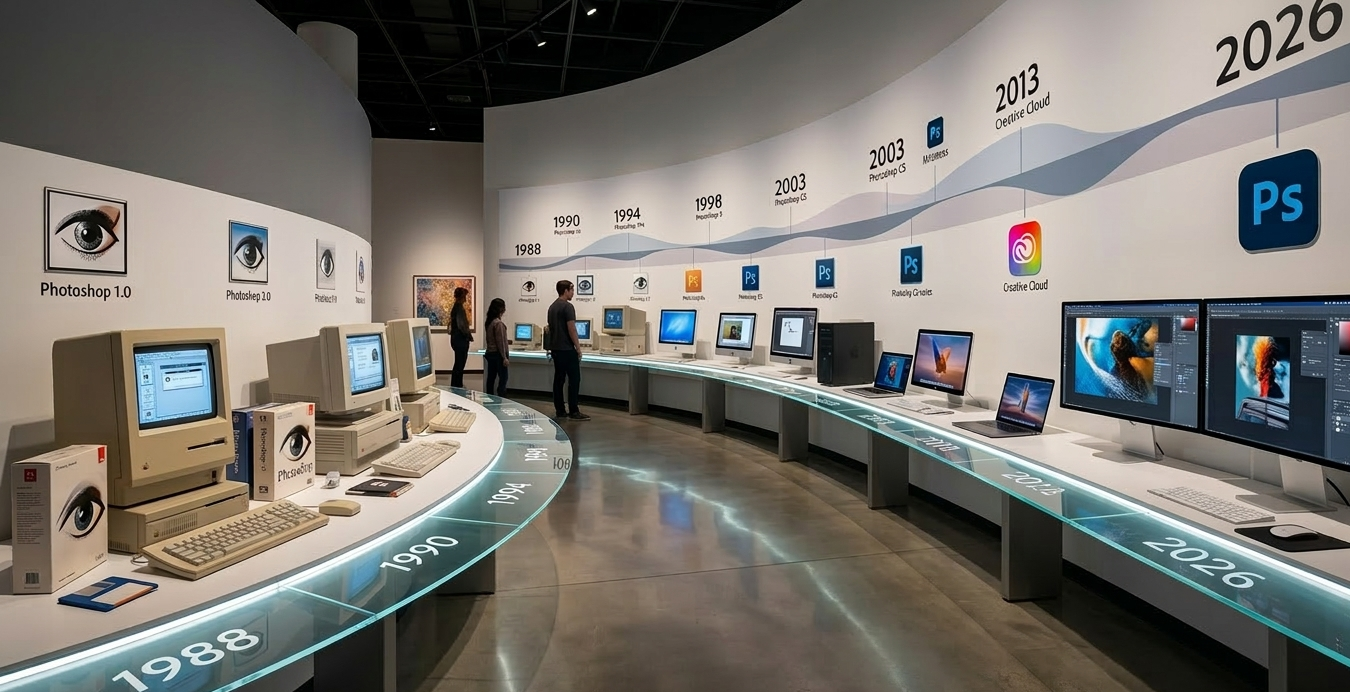 يمكن تلخيص رحلة تطور فوتوشوب من خلال المعالم الرئيسية التي قدمها في كل عقد: