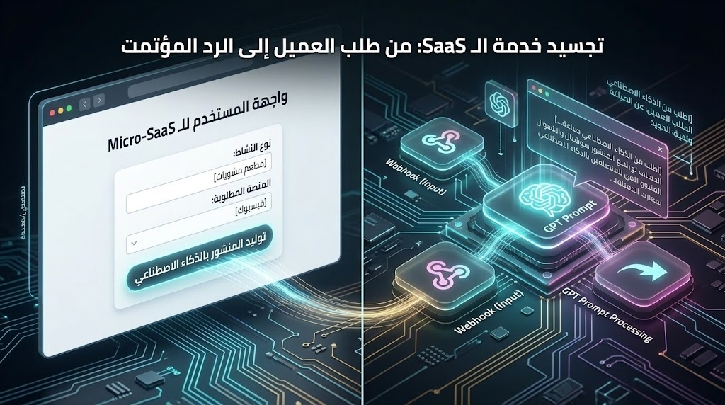 رسم توضيحي يوضح واجهة المستخدم الأمامية لمشروع SaaS المصغر وكيفية اتصالها بالخلفية المؤتمتة عبر مسار عمل n8n لتوليد منشورات السوشيال ميديا بالذكاء الاصطناعي.