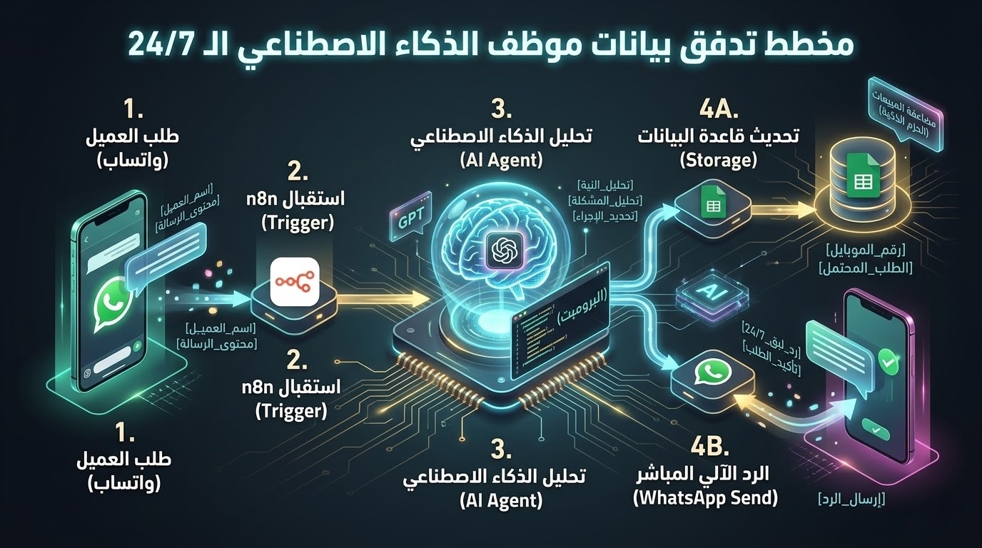 بعد تجهيز الاستضافة، ننتقل إلى بناء مسار العمل (Workflow) داخل n8n. تبدأ العملية بعقدة الاستقبال (Trigger) التي تتلقى رسالة العميل. لضمان وصول الموظف الذكي للعملاء أينما كانوا، يمكنك ربط هذا النظام بتطبيق واتساب. وقد شرحنا بالتفصيل كيف تفعل ذلك في الدليل الشامل لبناء بوت واتساب ذكي لخدمة العملاء باستخدام n8n والذكاء الاصطناعي.