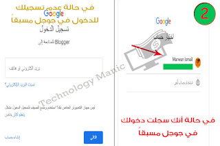 2- اختر حسابك على Google الذي تريد إنشاء مدونتك عليه أو إن كنت لم تسجل دخول مسبقاً فسجل دخولك.