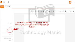 - إضافة "وصف البحث" لمقالتك على بلوجر ، ويجب أن يكون وصفاً مختصراً لفكرة الموضوع الذي تتكلم عنه ، مع إضافة به أيضاً كلماتك المفتاحية.